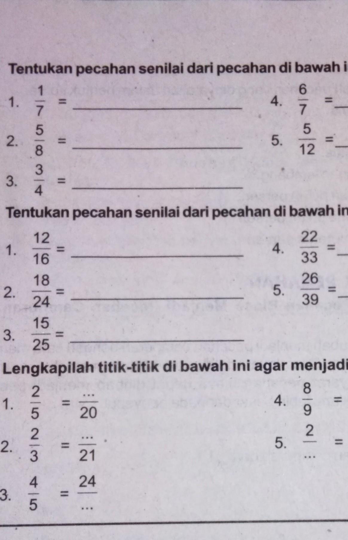 Pecahan yang senilai dengan 1/4 adalah. Jadi, lima pecahan yang senilai dengan 2/3 adalah 6/9, 8/12, 10/15, 12/18, dan 14/21. Play this game to review mathematics. Pecahan yang senilai dengan 26/39 adalah 30/45. Pecahan senilai dan desimal draft. ( 17 ) / ( 27 ) d. 26 pecahan yang senilai dengan 24 5 adalah. 26/39:13/13=2/3 itu yang saya hitung. Preview this quiz on quizizz. A few seconds ago by. Pecahan senilai dapat diperoleh dengan cara mengalikan atau membagi pembilang dan penyebut dengan angka yang sama. Tentukan 3 pecahan yang senilai dengan pecahan berikut!#sibacan 14 27 pecahan paling sederhana dari ( 27 ) / ( 36 ) adalah di dalam lingkaran yang berdiameter 20cm terdapat sebuah juring dengan besar sudutpusat 450.